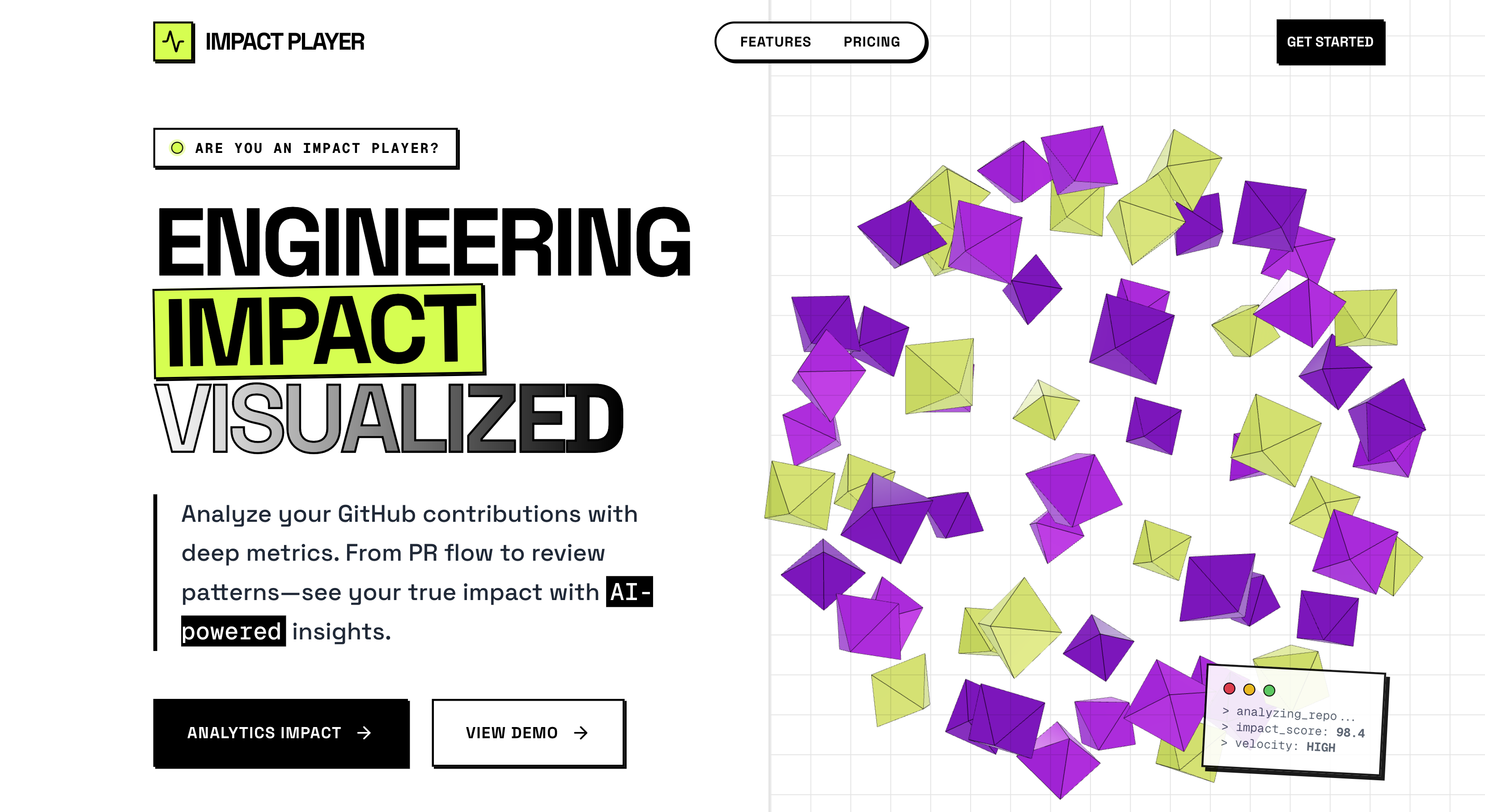 Analyze your GitHub contributions with deep metrics. From PR flow to review patterns—see your true impact with AI-powered insights.